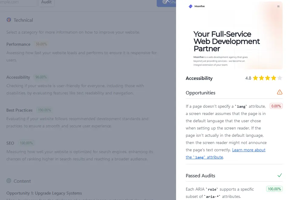 In the rapidly evolving digital landscape, web presence optimization is crucial for businesses of all sizes. Recognizing this need, Moonfive, a forward-thinking web development agency, embarked on an ambitious project to create a tool that empowers website owners with insightful, actionable data. The result of this endeavor is the Free Website Audit Tool, a cutting-edge solution designed to elevate online performance.