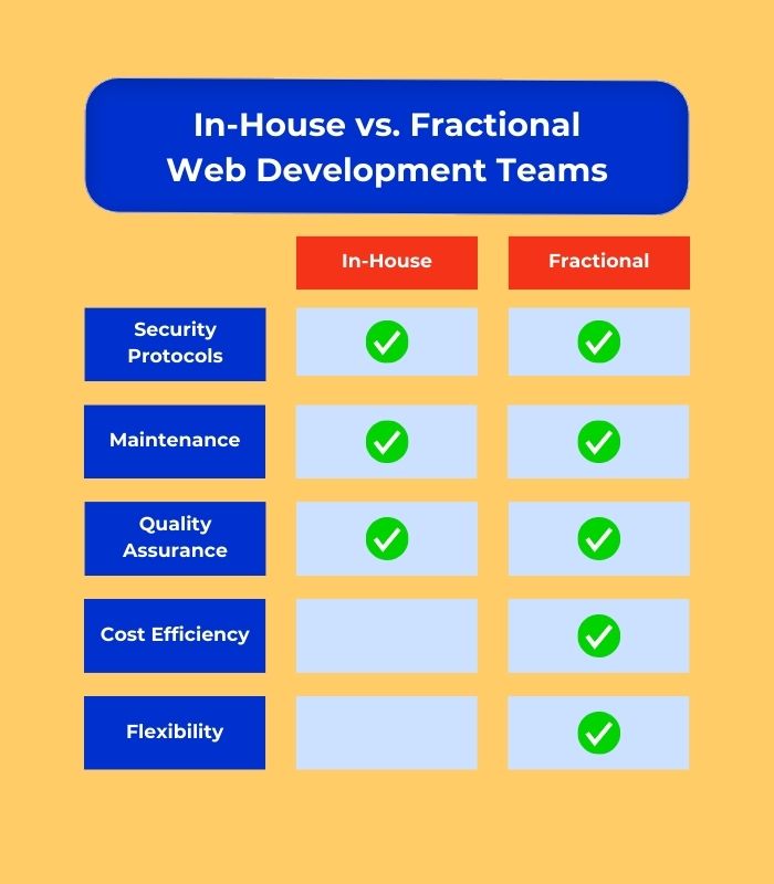 With a fractional web development team, you can delegate the complexities of web development and reduce the risks associated with managing an in-house team. This frees you to concentrate on your core business activities, without the added stress of training and supervision.